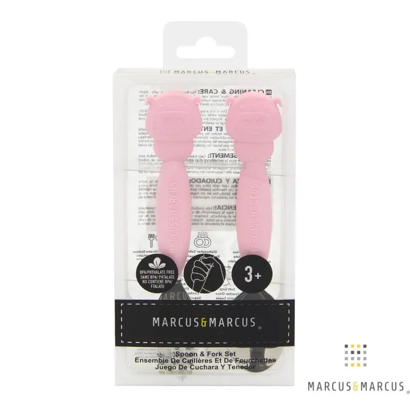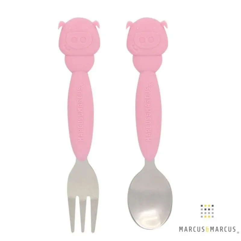 Marcus & Marcus 36m+ Κουτάλι Πιρούνι Set 2τμχ. Inox με Λαβή Σιλικόνης Γουρουνάκι