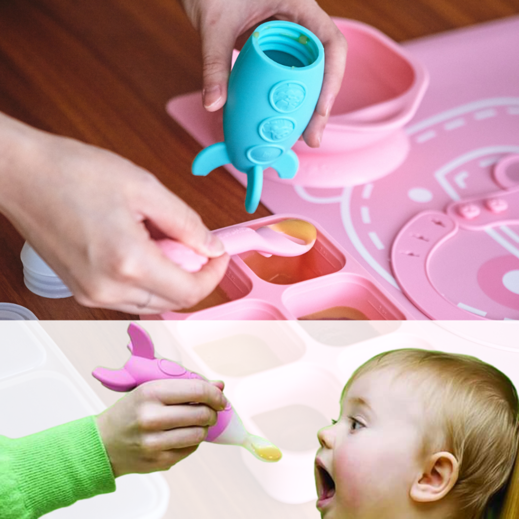 Βάζετε μέσα την παιδική τροφή, γλιτώνοντας σκεύη και κόπο, για να ταΐζετε το μωρό σας με το ένα χέρι, αφού έχετε ένα ενιαίο σκεύος που λειτουργεί και σαν πιάτο και σαν κουτάλι με ρυθμιζόμενη ελεγχόμενη ροή με τη πίεση που βάζετε στο απαλό πυραυλάκι!