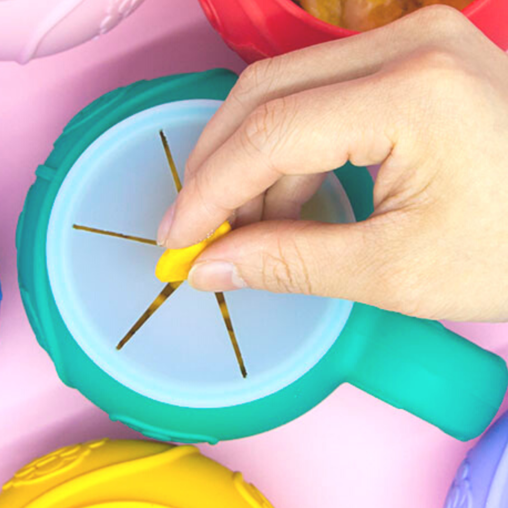 Με ειδικά σχεδιασμένο καπάκι σιλικόνης με σχισμές που επιτρέπουν στο παιδάκι να πάρει από μόνο του με τα δαχτυλάκια του το φαγητό χωρίς να υπάρχει φόβος να χυθεί.