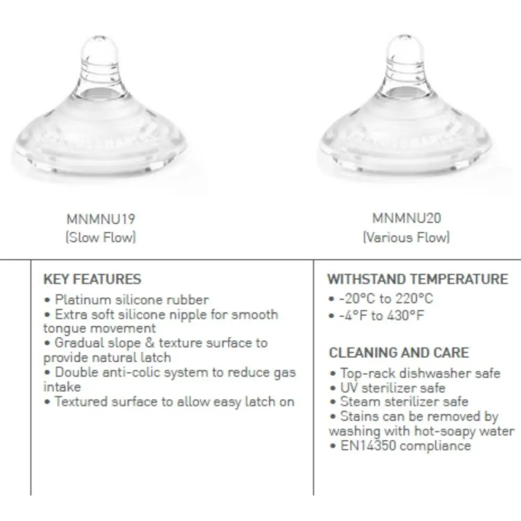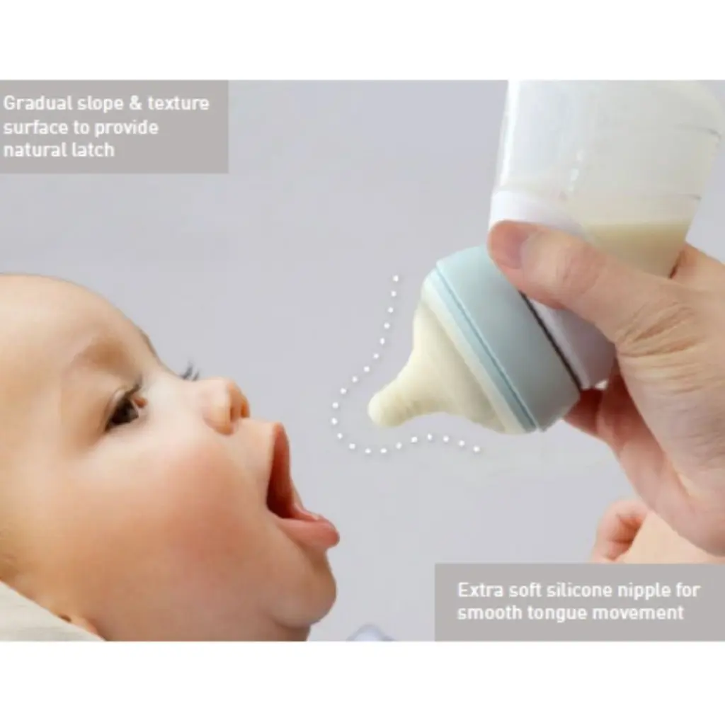 Η εξαιρετικά μαλακή θηλή τροφοδοσίας έχει σχεδιαστεί με σχήμα σταδιακής κλίσης που μοιάζει με ανθρώπινη θηλή και βοηθά τα μωρά να αποτρέψουν τη σύγχυση των θηλών κατά την εναλλαγή μεταξύ φυσικού θηλασμού και θηλασμού από θηλή μπιμπερό.