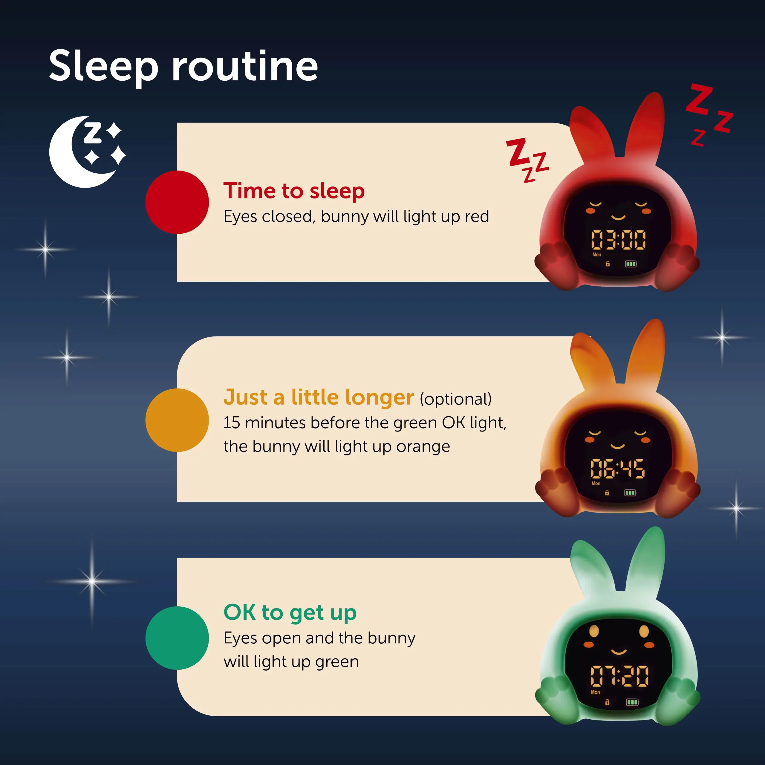 • Σταθερή ρουτίνα ύπνου: τα παιδιά μαθαίνουν να σηκώνονται μόνο με το «πράσινο φως».