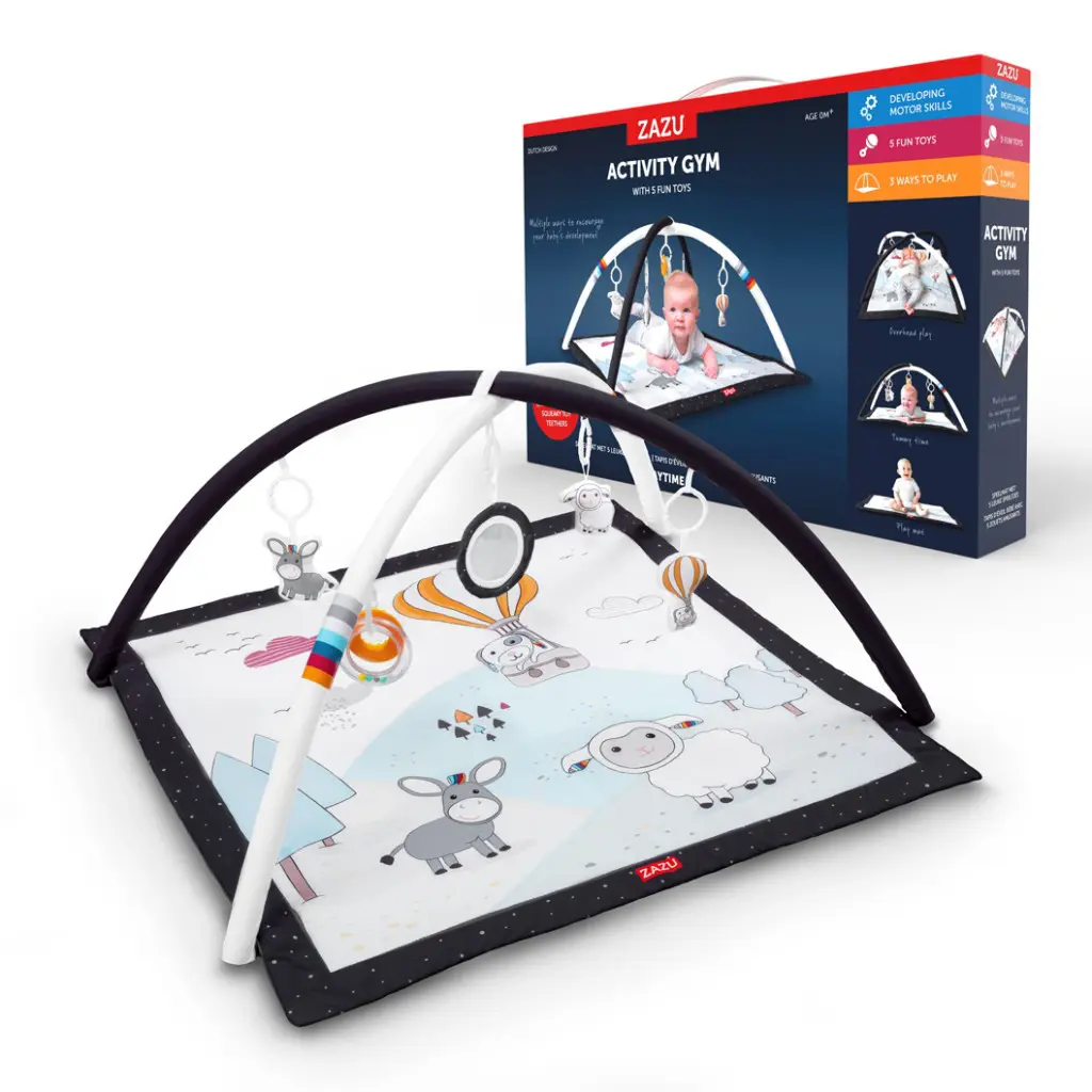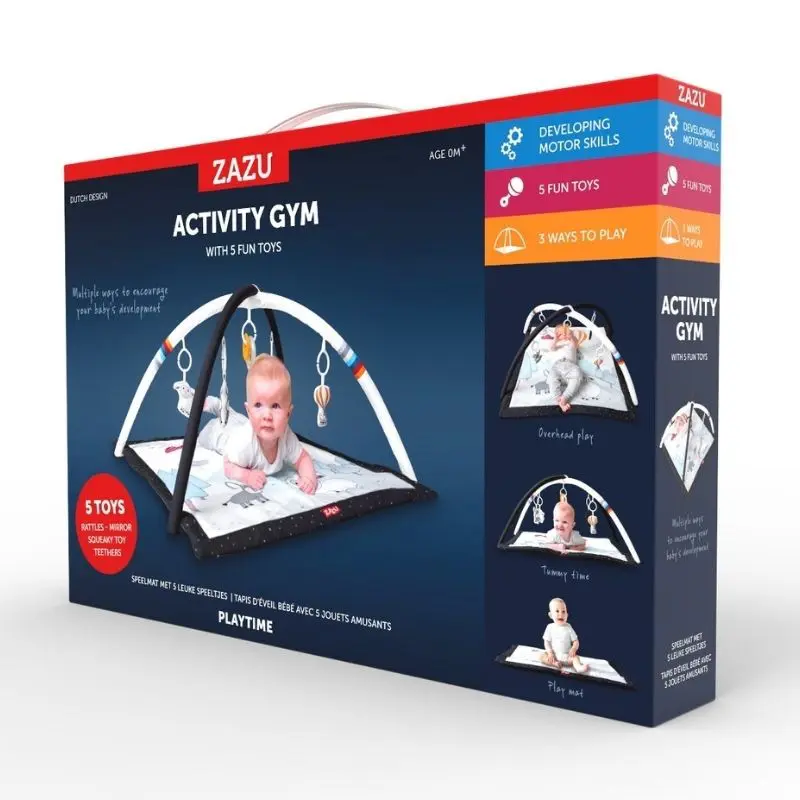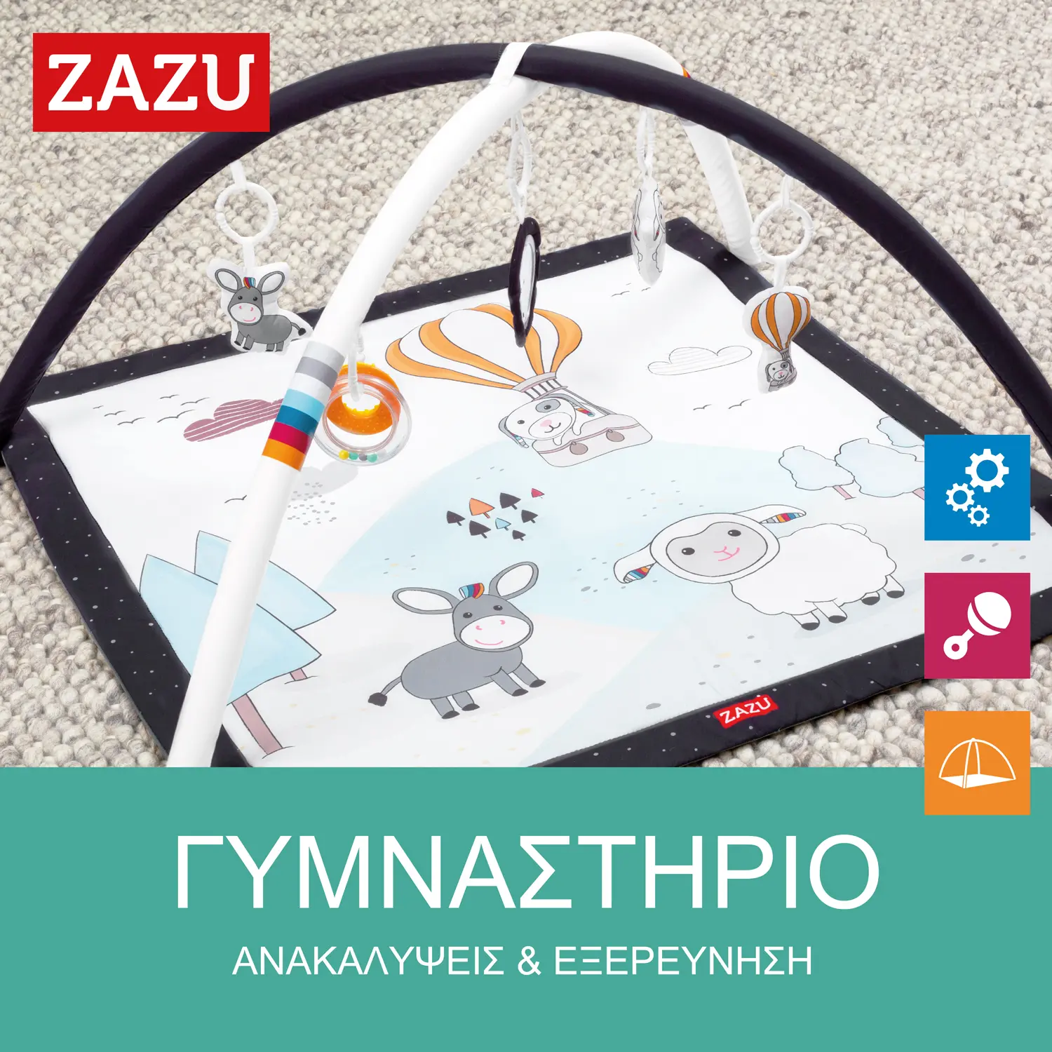 Το ZAZU Gym βοηθά το παιδί να ενδυναμώσει τους μυς του, να αναπτύξει συντονισμό ματιού-χεριού και να διεγείρει τις αισθήσεις του μέσα από διαφορετικές υφές, ήχους και κινήσεις.