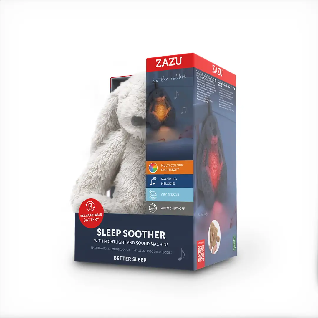 Το ZAZU Ro είναι ένα λούτρινο λαγουδάκι που λειτουργεί ως βοηθός ύπνου: συνδυάζει χαλαρωτικούς ήχους, φωτάκι νυκτός και αισθητήρα κλάματος (Cry Sensor), ώστε να δημιουργεί ένα οικείο και ασφαλές περιβάλλον για το μωρό.